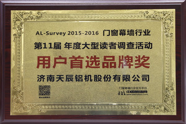 同期,由中國建筑金屬結構協(xié)會主辦,中國幕墻網(wǎng)承辦的“第十一屆AL-Survey2015-2016中國幕墻網(wǎng)年度大型讀者調(diào)查評選活動”頒獎儀式在在廣州廣交會威斯汀酒店隆重舉行,天辰股份榮獲“用戶首選品牌獎”。