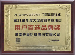 ???? 同期,由中國(guó)建筑金屬結(jié)構(gòu)協(xié)會(huì)主辦,中國(guó)幕墻網(wǎng)承辦的“第十一屆AL-Survey2015-2016中國(guó)幕墻網(wǎng)年度大型讀者調(diào)查評(píng)選活動(dòng)”頒獎(jiǎng)儀式在在廣州廣交會(huì)威斯汀酒店隆重舉行,天辰股份榮獲“用戶首選品牌獎(jiǎng)”。