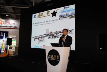 展會(huì)期間,在第二屆中國(guó)門(mén)窗幕墻年度星品評(píng)選中,天辰股份的數(shù)控四頭組角生產(chǎn)線以其填補(bǔ)國(guó)內(nèi)空白的先進(jìn)的技術(shù)及超高生產(chǎn)效率,獲得評(píng)審及專家的一致好評(píng),勇奪“星品獎(jiǎng)”。天辰股份市場(chǎng)部傅旺經(jīng)理在星品發(fā)布會(huì)上對(duì)該設(shè)備進(jìn)行了詳盡的技術(shù)闡述。
