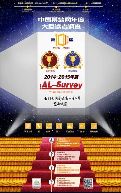 AL-Survey讀者調(diào)查活動全稱:中國幕墻網(wǎng)年度大型讀者調(diào)查暨“我最喜愛品牌”評選活動。(以下簡稱AL-Survey)我司濟(jì)南天辰鋁機(jī)股份有限公司作為門窗幕墻機(jī)械制造領(lǐng)域的資質(zhì)企業(yè),攜“天辰”品牌,強(qiáng)勢入圍本次調(diào)查活動。通過活動參與者的票